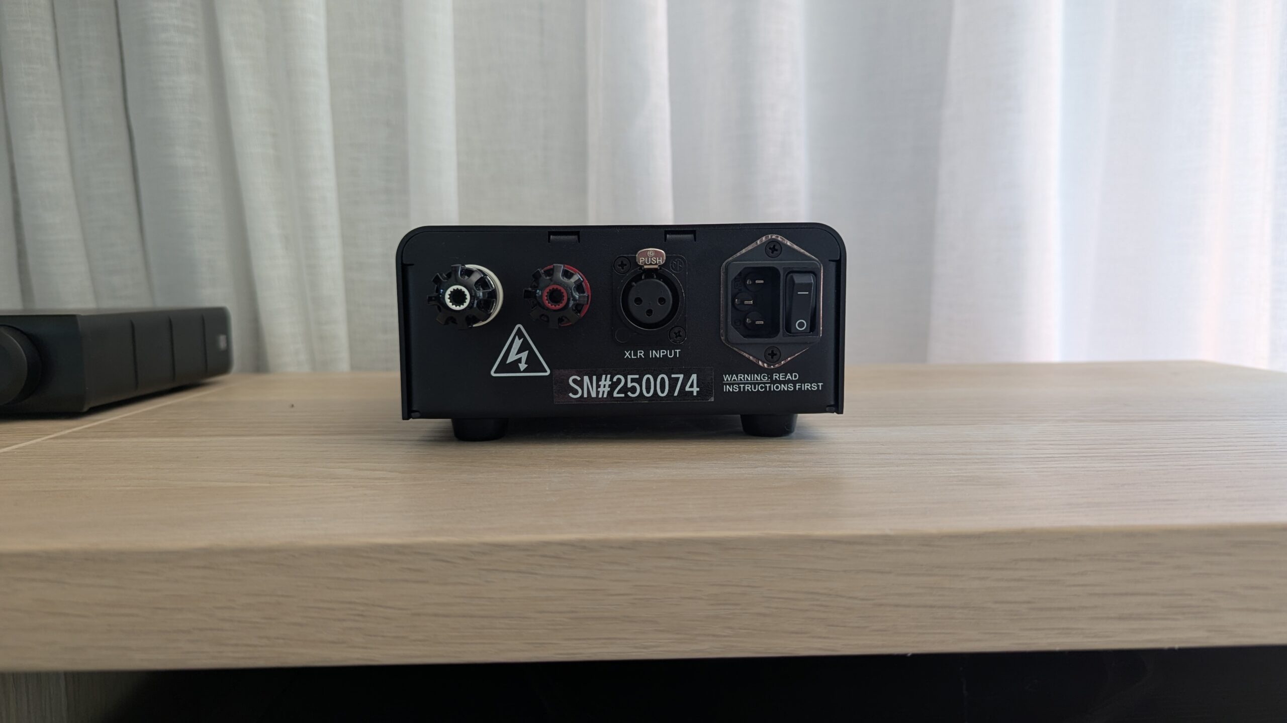 It’s a black sleek looking amp, with a lovely Orchard Audio logo embedded in the top of the case very tastefully done. The rear of the amp is super simple with only XLR inputs, power socket + switch and very robust speaker binding posts – me like!
